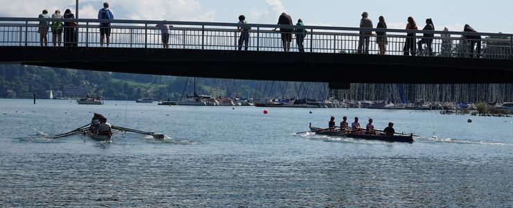Gestartet wurde gleich unter der Brücke, was für ein bisschen Extra-Nervenkitzel sorgte. Zwei Bahnen führten über knapp 100 Meter Richtung Ziel draussen in See– kurz, knackig und so intensiv, dass auch die Steuerleute ziemlich gefordert waren. Manche von ihnen vielleicht sogar ein wenig zu sehr: Beim Geradeausfahren muss offenbar noch geübt werden, wie ein Ruderbruch beweist. (Wir verbuchen das unter «Materialprüfung für Fortgeschrittene»).